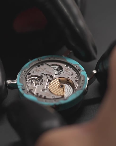 La montre Louis Vuitton Escale Turquoise révèle un cadran et une carrure en pierre bleu vif, parcourus de veines aux motifs intenses — rendant chaque pièce unique. Cette montre de 40 mm reflète l'expertise de La Fabrique des Boîtiers, l'atelier genevois de Louis Vuitton dédié à l'art complexe de la fabrication de boîtiers de haute technicité.