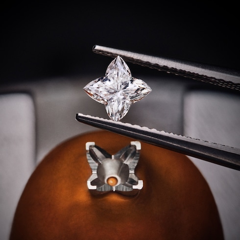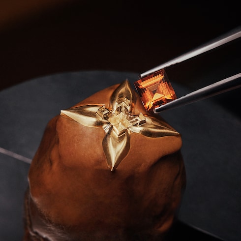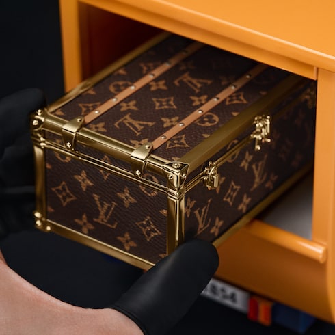 Série limitée à 15 exemplaires, cette précieuse version de la Camionnette Louis Vuitton réunit le savoir-faire de la Haute Horlogerie, de la malleterie et de la joaillerie dans une création unique. Sur ses parois plaquées or et polies miroir, le Damier guilloché réalisé à la main est serti de diamants — des saphirs orange et rouges taille baguette et un diamant taille LV Monogram Star viennent compléter la création.