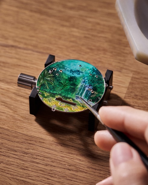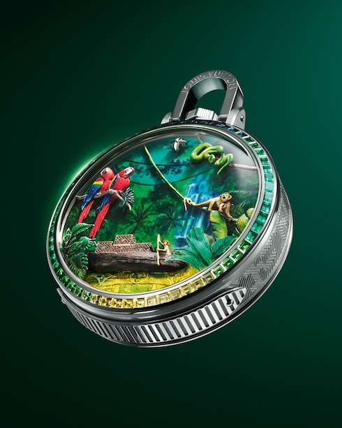 Conjuguant une audace créative inédite à l'expertise horlogère des artisans de La Fabrique du Temps Louis Vuitton, la Maison s'aventure au coeur de la forêt amazonienne — illustrant une des montres Louis Vuitton les plus complexes. Sublimé par sept animations différentes, le cadran présente un paysage extrêmement détaillé tandis que le dos de la montre révèle une seconde perspective en transparence : le calibre à automates et répétition minutes LFT AU14.03, aux finitions artisanales exceptionnelles.