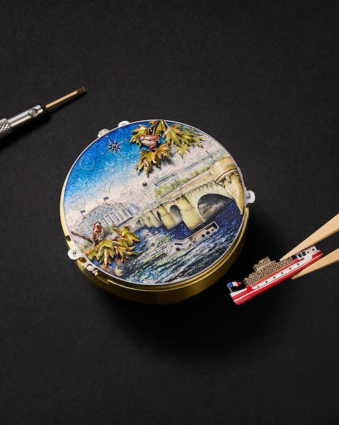 Ode à l'héritage malletier et à l'esprit d'innovation de la Maison, la montre de poche Escale au Pont-Neuf célèbre l'histoire de Louis Vuitton - dévoilant un panorama situé sur les rives de la Seine, en surplomb du plus vieux pont de Paris. Le cadran prend vie à travers sept animations, emmenées par le mouvement mécanique le plus complexe de la Manufacture à ce jour : le calibre LFT AU14.03 à remontage manuel, révélant un savoir-faire méticuleux à travers le fond du boîtier.