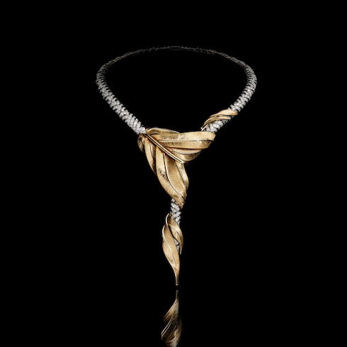 Triumph incarne la résilience et la renaissance — l'étape finale de l'accomplissement. Des ailes d’or gravées à la main, aux finitions sablées et poli miroir, se déploient en un long collier formant subtilement le V signature de Vuitton, où l’or jaune enlace une corde d’or blanc, pavée de 1 350 diamants dans un jeu de lumière.