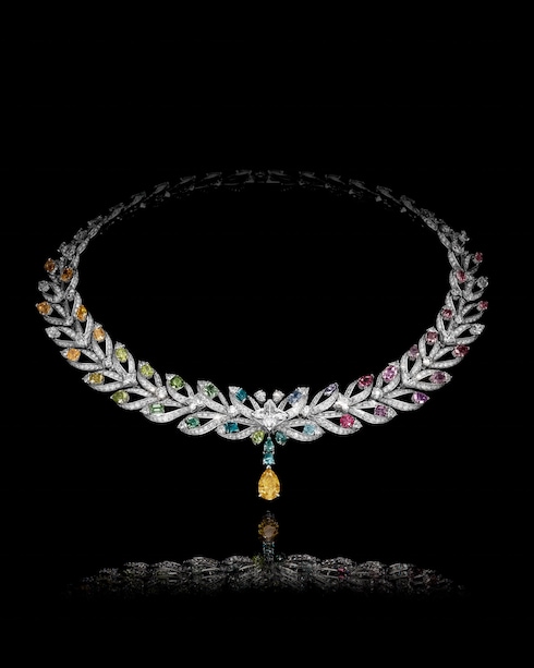 Porté par Sirius, l’étoile du soir, ce thème capture la sérénité d’un ciel étoilé et la guidance céleste d’un univers mythique. Une constellation de 13 pierres — tourmalines, aigues-marines et tanzanites totalisant 249,31 carats — se déploie le long d’une corde de diamants, tandis que le revers du collier est serti en pavage d’émeraudes, de saphirs, de tourmalines Paraiba et de diamants en forme d'étoiles inspirées du motif Monogram.