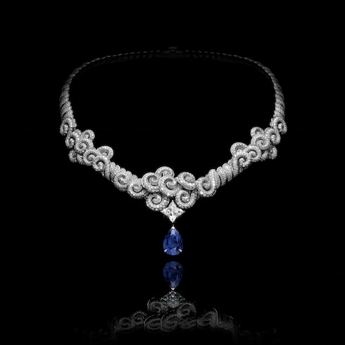 Aérien et lumineux, Whisper guide l’héroïne à travers les rêves — un souffle de sagesse et de grâce sereine. Des volutes pavées de diamants en or blanc se posent avec légèreté sur le cou, ponctuées d’un saphir Royal Blue de 11,56 carats et d’un diamant taille LV Monogram Star de 4,11 carats D Flawless, dans une création transformable à l’élégance subtile.