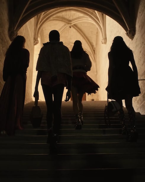 Associant silhouettes médiévales théâtrales, lignes féminines et héritage maroquinier, la collection transcende les époques pour révéler un récit imaginatif évocateur. Volumes architecturaux et ornements métalliques résonnent au fil des sacs, souliers et accessoires — reliques d'un passé réimaginé.