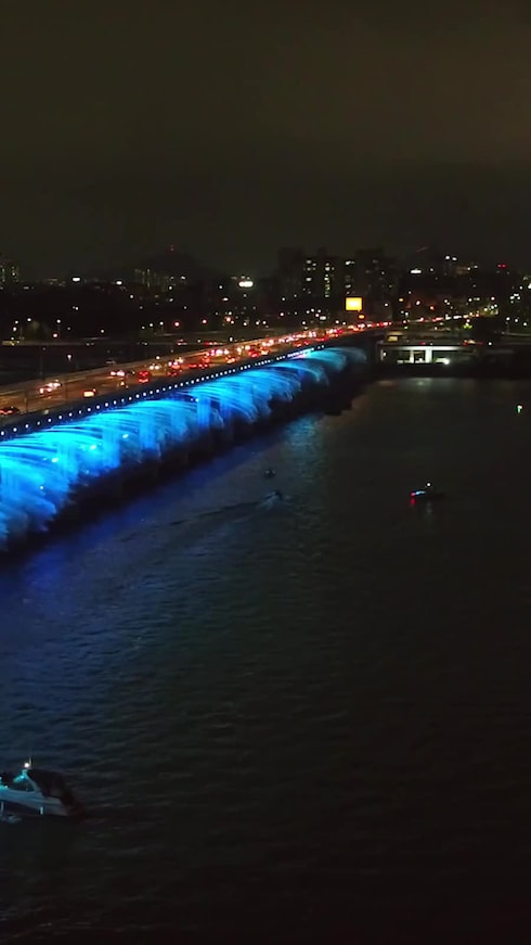 Hwang Dong-Hyuk, réalisateur de la série Squid Game, imagine une scénographie immersive sur l’emblématique pont Jamsugyo de Séoul. Dans un jeu d'eau et de lumière, son décor reflète l’incroyable énergie d’une mégalopole où passé, présent et futur cohabitent en harmonie.