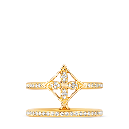 Issue de la collection Idylle Blossom, cette bague confectionnée en or jaune 18 karats est pavée de diamants étincelants. Une fleur de Monogram orne le premier anneau de ce bijou résolument moderne qui évoque deux bagues superposées. Elle s'associe de différentes façons à d'autres pièces de la collection selon les envies et les styles.
