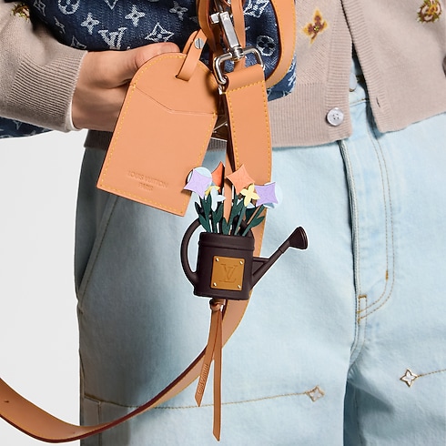 Le bijou de sac LV Flowers Watering Can évoque la poésie et le renouveau d’une nouvelle saison. Une composition foisonnante de fleurs colorées, réinterprétant les fleurs de Monogram emblématiques, s’épanouit depuis un arrosoir brun rehaussé des initiales de la Maison. Ce bijou de sac peut se fixer à un sac ou se porter directement sur un pantalon.