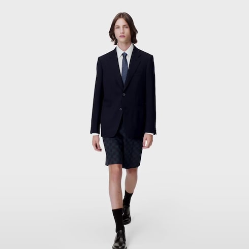 Inspiré de la mode anglo-saxonne, ce blazer en sergé de laine mélangée prête un esprit décontracté aux tenues habillées. Proposée en bleu marine chic, la silhouette intemporelle se pare discrètement de boutons LV et fleur de Monogram métalliques. Associée à un pantalon ajustable, cette pièce compose un costume moderne informel.