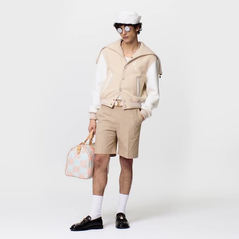 Ce blouson varsity exclusif doté de manches en cuir de veau revisite un emblème de la Maison. Son col marin peut se transformer en capuche grâce à une fermeture éclair. La partie principale en laine légère à la nuance crème ensoleillée se pare de signatures en perles, d'un slogan brodé sur la capuche et d'une broderie LV Seashells ton sur ton sur la poitrine. Des boutons-pression effet nacré apportent de la sophistication à cette pièce d'exception.