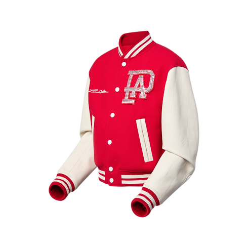 S'inspirant du passé de percussionniste de Pharrell Williams au sein de l'orchestre du lycée Princess Anne en Virginie, ce blouson varsity rouge vif allie tradition américaine et savoir-faire Louis Vuitton. Issu du défilé Printemps-Été 2024, ce modèle emblématique s'habille d'un motif Damier ton sur ton embossé sur ses manches en cuir de veau blanc. Le dos s'agrémente d'une signature Louis Vuitton brodée de perles, tandis qu'un patch PA brodé de cristaux sur la poitrine évoque la jeunesse de Pharrell Williams.