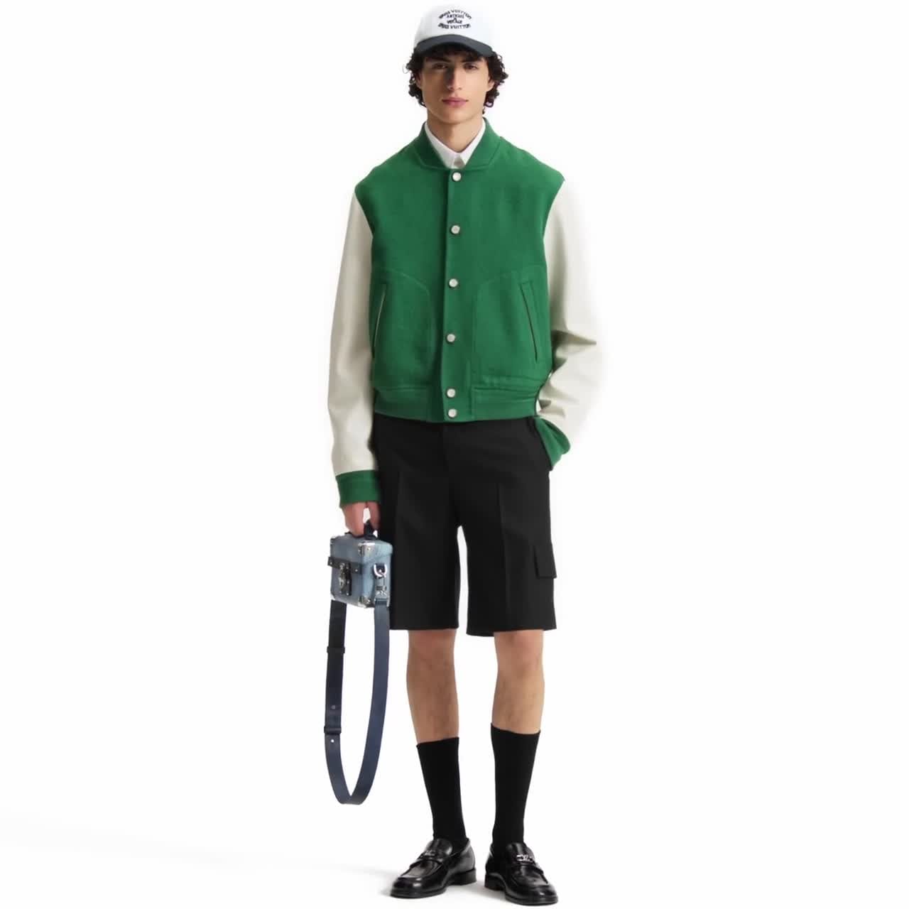 Ce blouson varsity revisite le modèle classique dans une version estivale à la fois sobre et sophistiquée. Réalisée en jacquard vert agrémenté d'un motif Monogram discret, la partie principale en laine légère non doublée contraste avec les manches en cuir de veau grainé blanc. Une étiquette tissée « Marque L. Vuitton Déposée » signe le dos, tandis que des boutons-pression nacrés ajoutent une touche chic à l'ensemble.