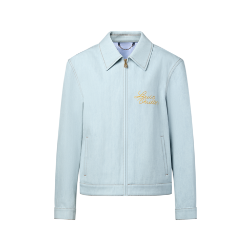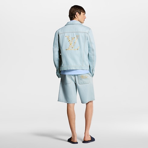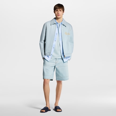 Ce blouson workwear à la fois décontracté et élégant est confectionné en denim biologique délavé dans une teinte claire. Une broderie Louis Vuitton manuscrite dorée souligne le côté gauche de la poitrine, tandis qu’une broderie florale LV Blooming au dos met en lumière le savoir-faire de la Maison. Des surpiqûres couleur tabac et une doublure vichy lumineuse viennent compléter ce modèle. Porté avec le short assorti, il compose un ensemble estival harmonieux.
