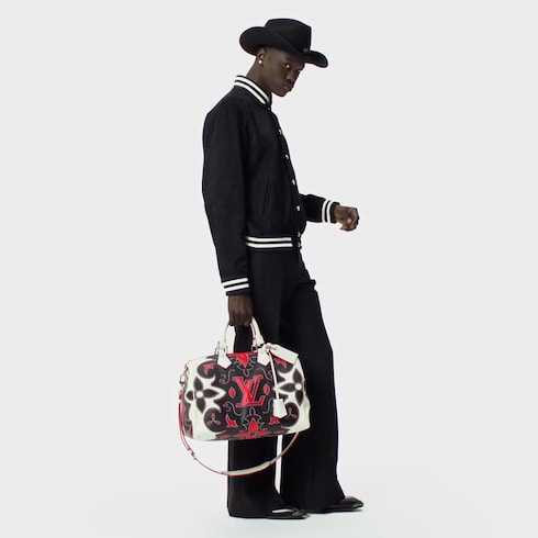 Confectionné en daim noir, ce bomber élégant se distingue par une fleur de Monogram en cuir blanc ornée de cristaux sur la poitrine et un patch « Marque L. Vuitton déposée » scintillant au dos. Des bords côtelés à rayures noires et blanches soulignent le col et les ourlets d'une note sportive, tandis que des boutons-pression effet perle renforcent l'allure sophistiquée de cette pièce contemporaine.
