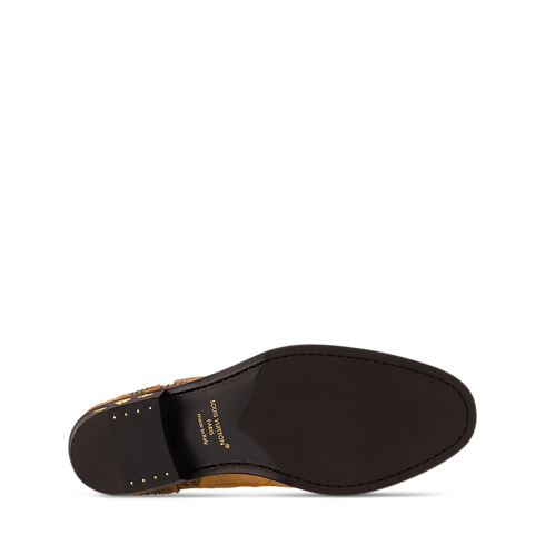 Aperçue pour la première fois lors du défilé Homme Automne-Hiver 2024 de Pharrell Williams, cette botte LV Rider incontournable est proposée sur commande dans une version exceptionnelle combinant du cuir d'autruche, de python et d'alligator. Les trois cuirs exotiques sont cousus ensemble pour créer un motif en losanges aux différentes textures. Ce modèle s'orne de la signature Vuitton embossée sur les brides d'enfilage et de fleurs de Monogram dorées sur le talon.