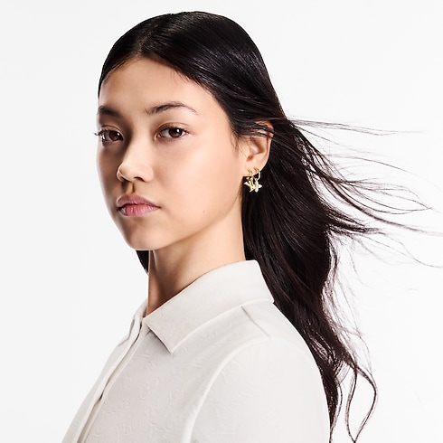 Chaque pièce de ce set de boucles d'oreilles LV Floragram met en lumière un emblème différent de Louis Vuitton. Ces modèles coordonnés présentent chacun leur tour une fleur de Monogram pointue, une fleur de Monogram arrondie et les LV Initiales. Ce tri