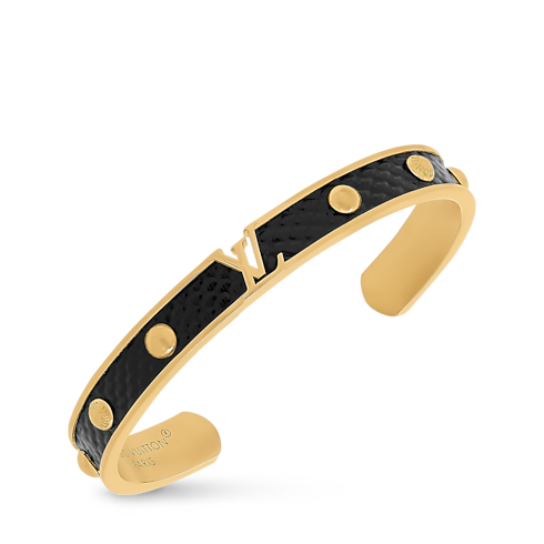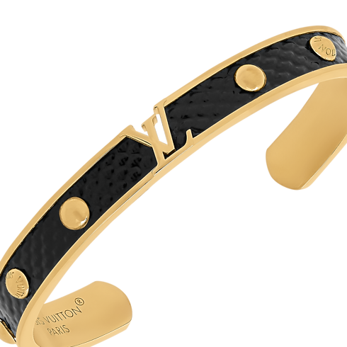 Ce remarquable bracelet LV Initiales se compose d'un bandeau en métal doré doublé de précieux cuir karung, rehaussé de rivets qui lui confèrent un charme contemporain. L'élément central constitué des célèbres initiales de la Maison, se distingue par un jeu de découpes sophistiquées. Parfait pour un usage quotidien, ce bracelet à la fois actuel et intemporel est une véritable pièce forte.