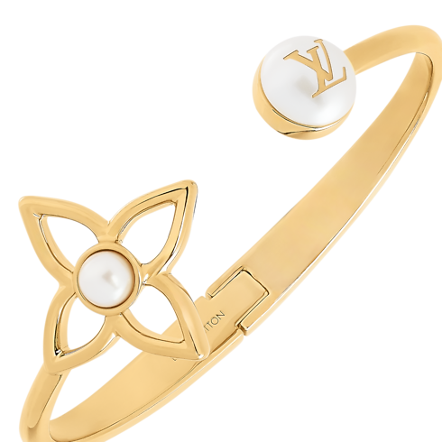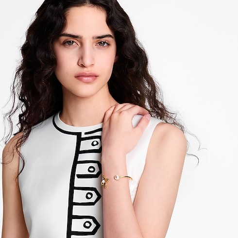 Ce bracelet Pearly Flower associe la signature Monogram emblématique au symbolisme de la perle dans un design glamour. Confectionné en métal doré, il présente une fleur de Monogram ajourée ainsi que deux perles en résine, dont l’une est rehaussée des LV Initiales. Ce bijou d’exception insuffle à chaque tenue un raffinement empreint de féminité.