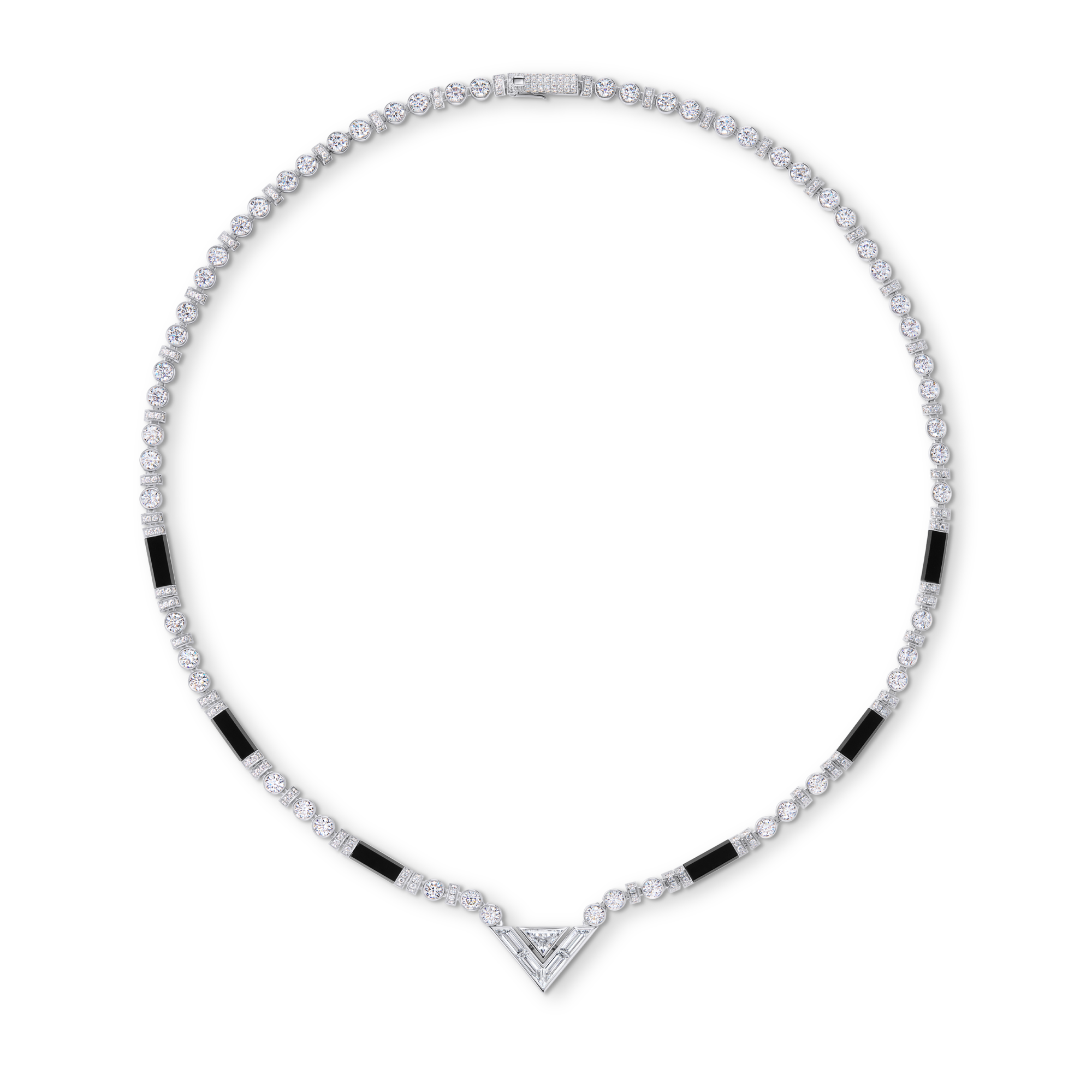 Les bijoux contemporains et intemporels de la collection Pure V expriment l’essence de la signature V for Vuitton avec une élégance épurée et discrète. Associant la laque noire brillante et l'or blanc 18 carats pavé de diamants, ce bracelet présente quatre V majestueux, dont l’un est sublimé par un somptueux diamant taillé en triangle. Cette pièce d’exception s’associe superbement avec les autres créations de la ligne de joaillerie Pure V.