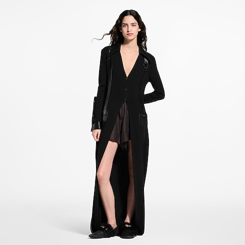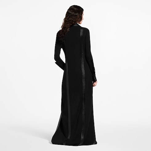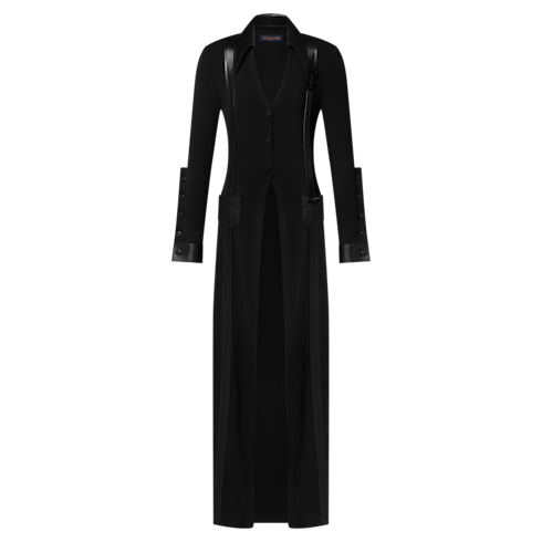 Ce cardigan long issu du défilé adopte une coupe cintrée en laine côtelée. Du cuir d'agneau sublime les boutons, le col en pointe, les poches plaquées, les poignets ainsi que les garnitures graphiques le long de la silhouette. Un crochet pivotant apporte une note utilitaire au niveau de la poitrine, tandis qu'un écusson Louis Vuitton Paris signe la hanche.