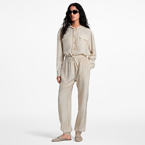 Cette chemise affirme une élégance sophistiquée grâce à sa coupe carrée nette, rehaussée d’une capuche décontractée à cordon. Confectionnée en soie fluide ornée du motif Monogram Cloud onirique décliné dans des nuances de saison douces, elle s’illumine d’accents métalliques dorés pour offrir une note de raffinement, dont un détail fleur de Monogram sur l’une des deux poches à rabat.