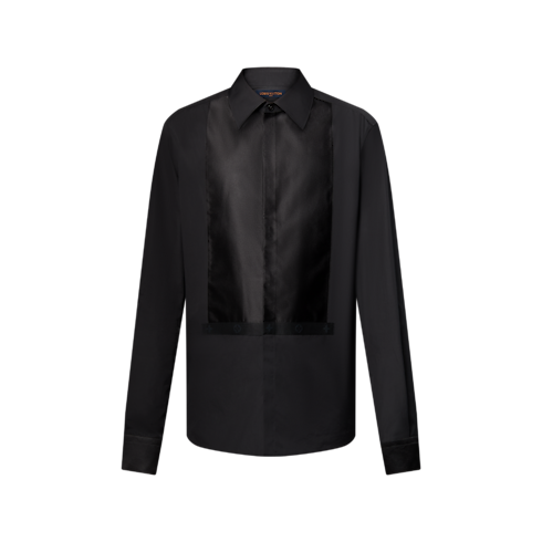 Cette chemise du soir raffinée revisite un style classique avec une note contemporaine. Elle est réalisée en popeline de coton noire, rehaussée par un plastron et des poignets en satin. Une bande en jacquard ornée d’éléments Monogram met en valeur l'avant, tandis que des étiquettes tissées signent la patte de boutonnage et le dos. Cette pièce d’exception se porte idéalement sous un smoking pour composer une tenue de soirée élégante.