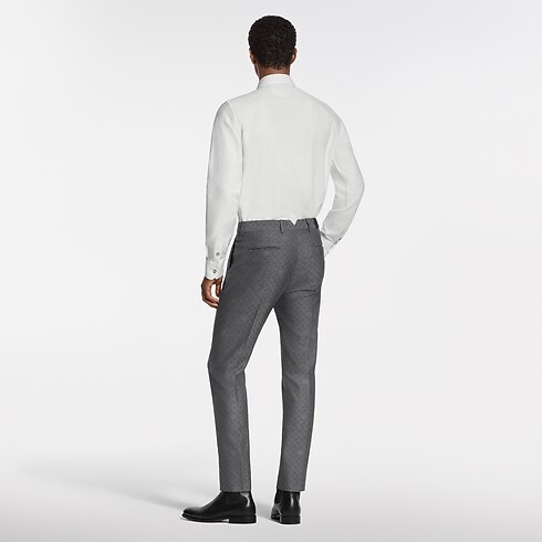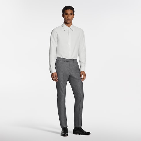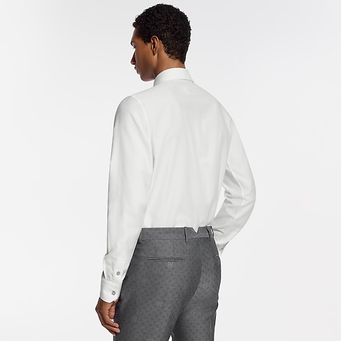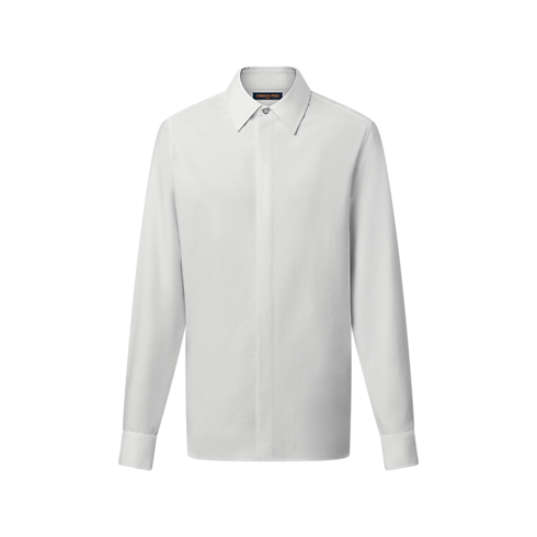 Cette élégante chemise de soirée blanche est confectionnée dans un coton biologique d’exception. Sa silhouette épurée, dotée d’une patte de boutonnage dissimulée, est sublimée par un motif jacquard Spaced Mini Monogram ton sur ton. Un bouton LV vient fermer le col, tandis qu’une étiquette à signature ton sur ton orne la patte de boutonnage. Cette pièce sophistiquée peut se porter avec le costume au même motif.