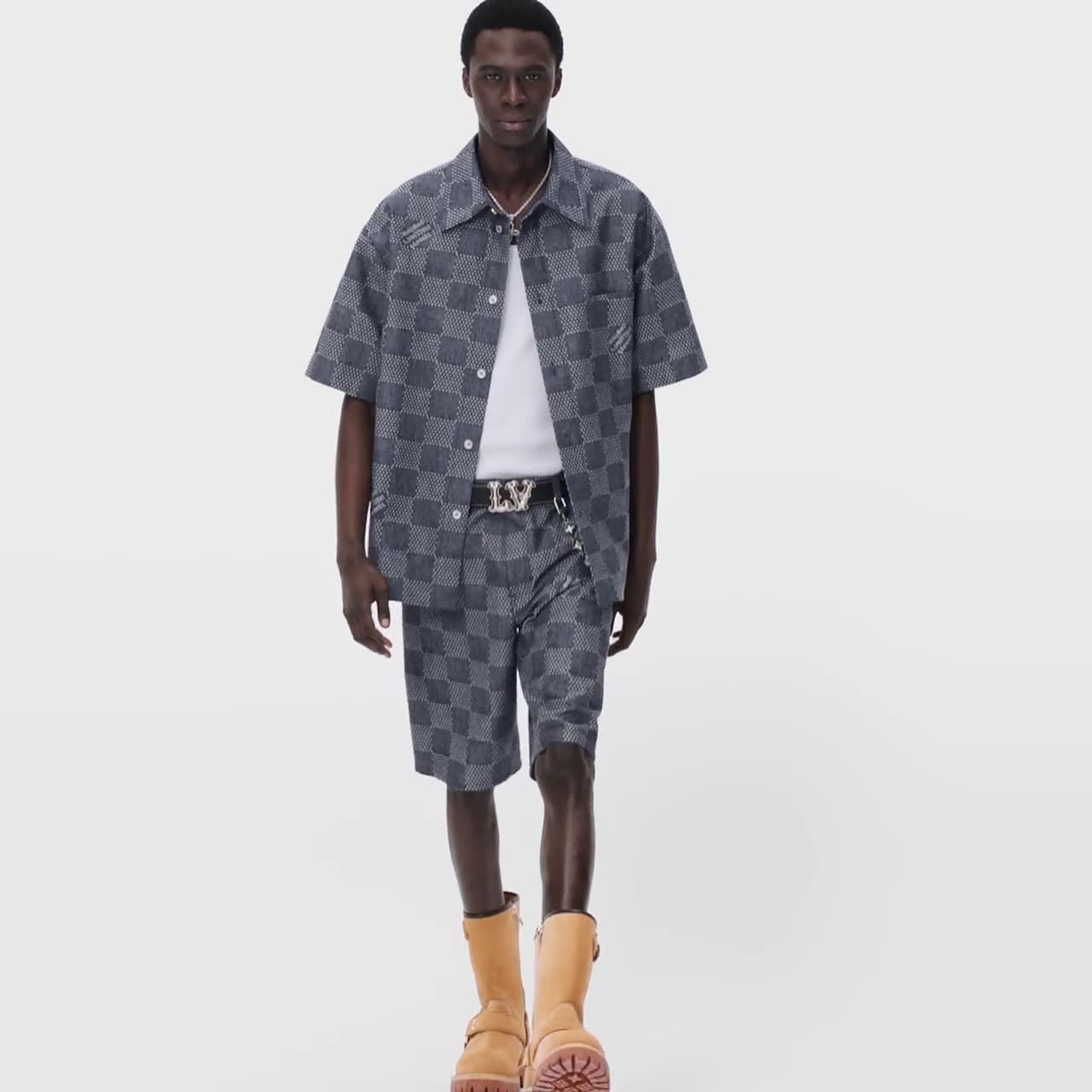Cette chemise graphique à manches courtes revisite une silhouette workwear avec un jacquard Damier sophistiqué à motif graine qui crée une impression de légèreté. Le tissage en chambray fin intègre des signatures « Marque L. Vuitton déposée », tandis que les boutons à effet nacre prêtent une note élégante à l'ensemble. Ce modèle peut se porter avec le short assorti pour composer un ensemble estival raffiné.