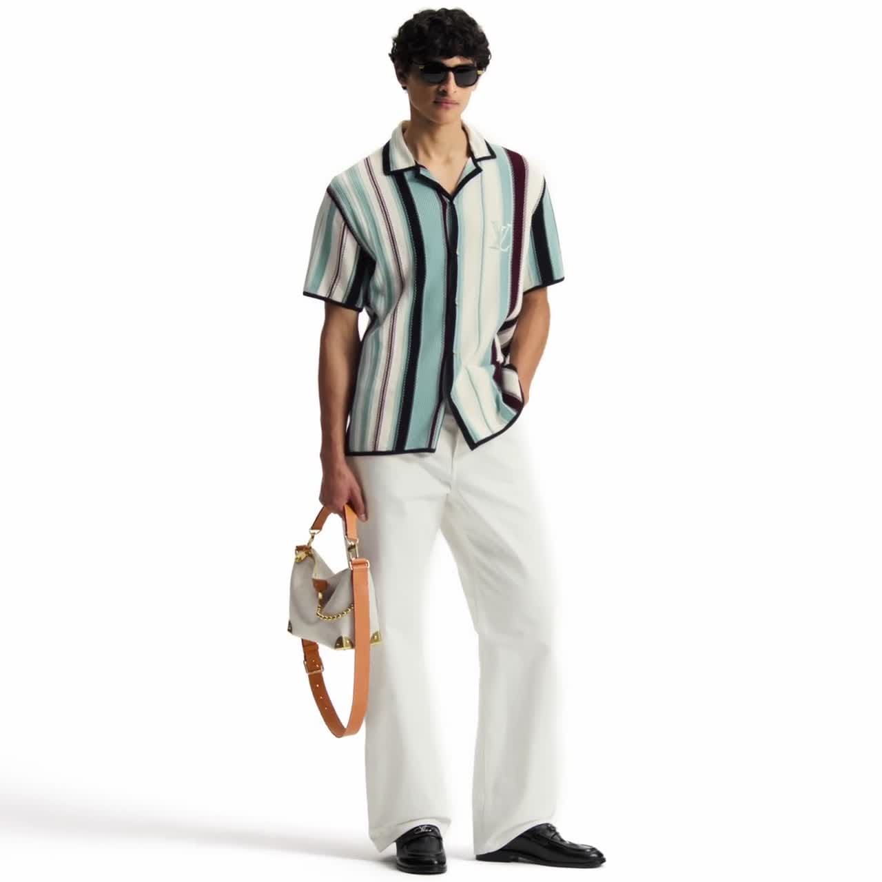 Confectionnée en coton bio, cette chemise à manches courtes se distingue par ses rayures verticales colorées en crochet. Des signatures brodées satinées ornent la poitrine et le dos, tandis que des boutons effet nacre agrémentent la fermeture. Cette pièce graphique doit son élégance décontractée à sa maille lâche et respirante. Portée avec le short assorti, elle se prête aux moments de détente sur le pont d'un bateau de croisière.