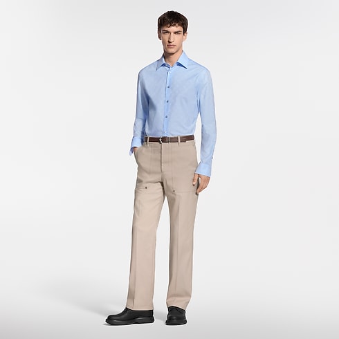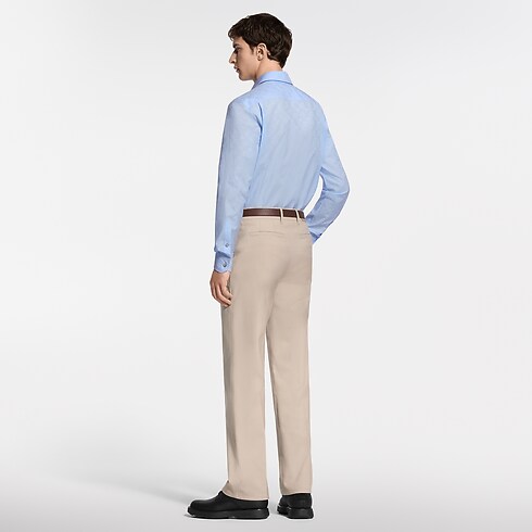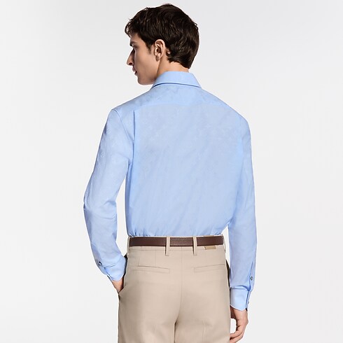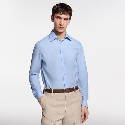 Cette chemise à manches longues bleu pâle se distingue par un jacquard Monogram ton sur ton subtil. Un LV orne le bouton du haut, tandis qu'une étiquette LV et fleurs de Monogram discrète sublime le bas de la patte de boutonnage. Cet essentiel intemporel de la garde-robe peut se porter avec un costume orné du même motif pour composer un look professionnel élégant.