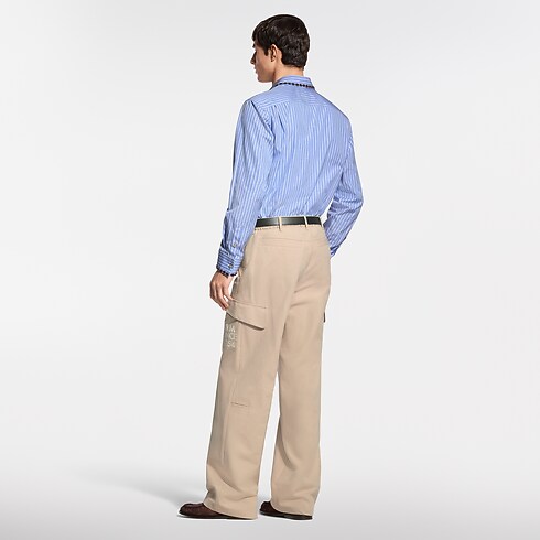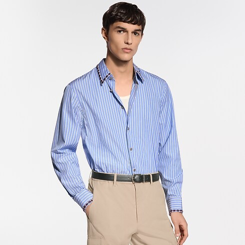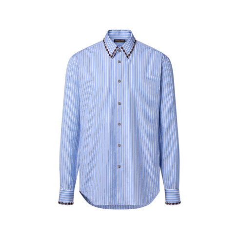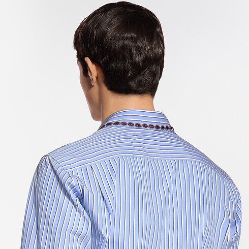 Cette chemise à manches longues s’inspire de l’esprit dandy indien du défilé Printemps-Été 2026. Confectionnée en coton biologique, elle présente un jacquard rayé d’inspiration vintage dans des nuances fraîches de bleu. Des perles minutieusement brodées sur le col et les poignets apportent un effet bijou. Idéale en superposition, cette pièce confère une touche de sophistication à toute silhouette.