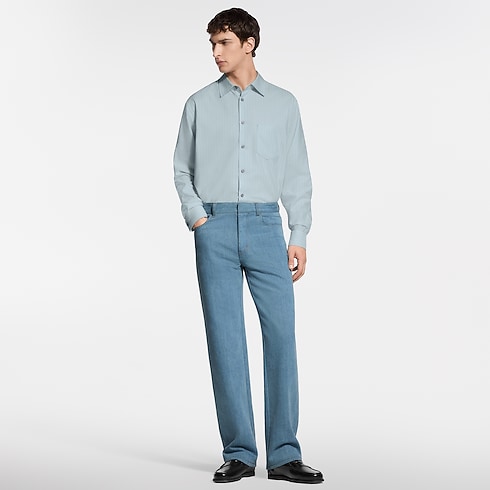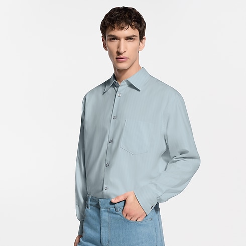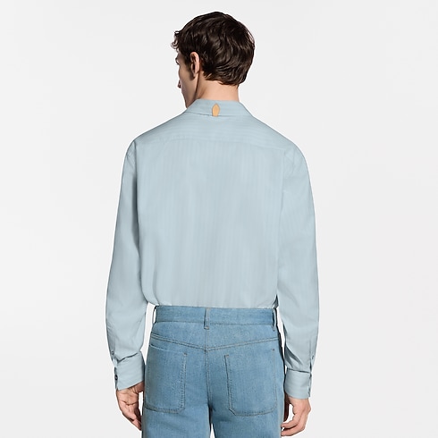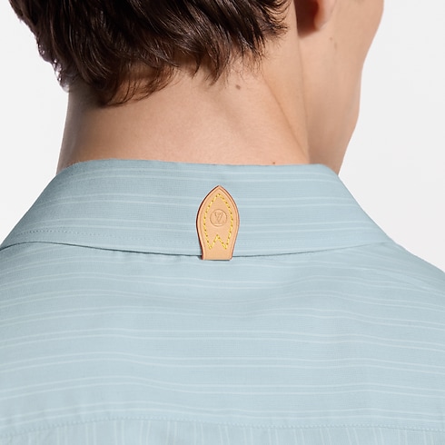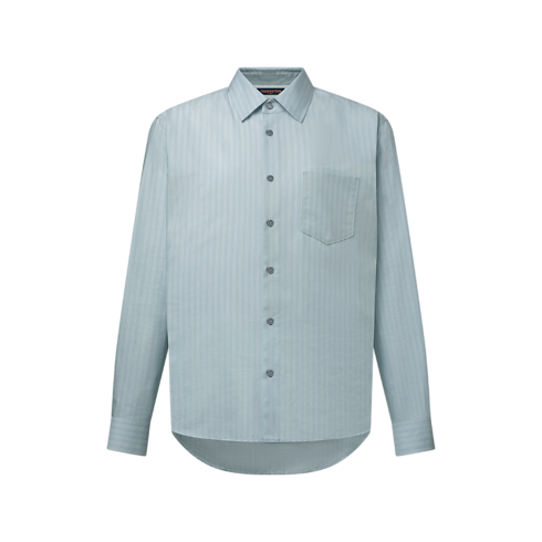 Un somptueux mélange de soie, de coton et de cachemire confère à cette chemise rayée bleu pâle une légèreté aérienne. Cette pièce compose une allure habillée ou décontractée, se superpose élégamment à d’autres vêtements ou peut même être nouée négligemment autour de la taille. Une couture LV orne le premier bouton, tandis qu’une languette en cuir naturel à l'arrière du col rend hommage à la tradition du voyage de la Maison.