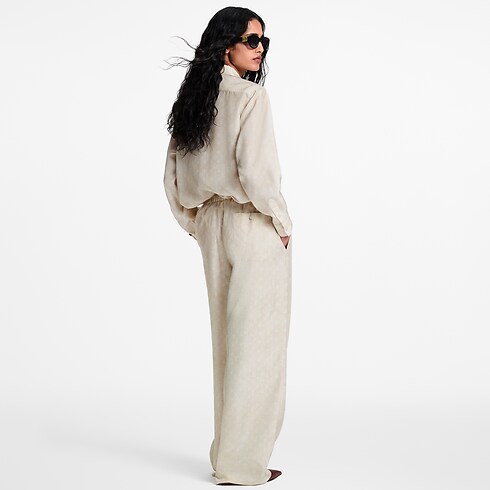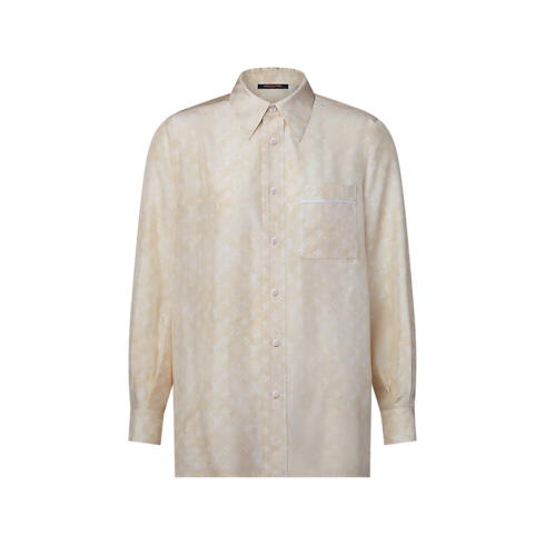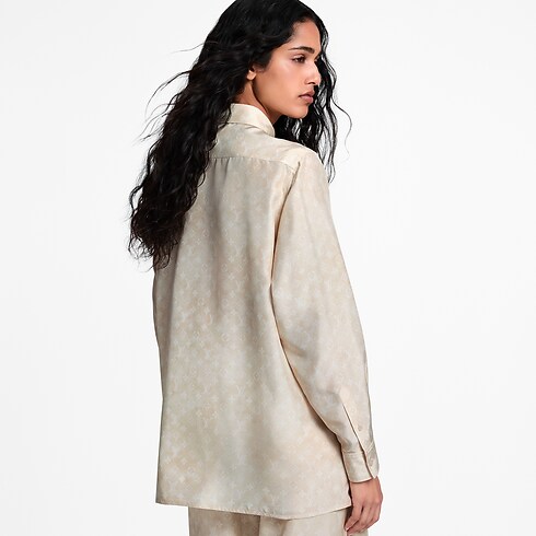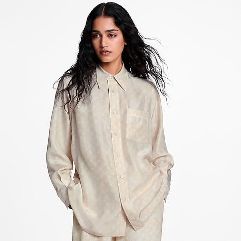Cette chemise à la coupe oversize et masculine est confectionnée dans une soie douce et fluide pour composer une silhouette aérienne. Elle se distingue par le motif Monogram Cloud décliné dans une palette de saison discrète, tandis qu’un col en pointe, une fermeture boutonnée et une poche plaquée évoquent les codes intemporels du tailoring.
