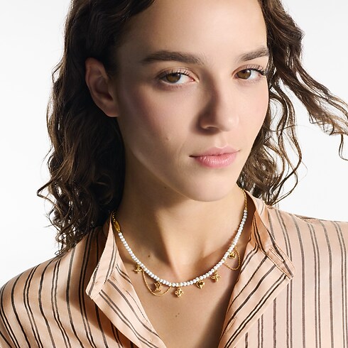 Ce collier Blooming Pearls met à l'honneur les emblèmes de la Maison dans une association sophistiquée remarquable. Il se compose d'une rangée de perles en verre brillantes sublimée par une série de pendentifs en métal doré réunissant les LV Initiales, les fleurs de Monogram et deux cœurs précieux. Son raffinement épuré rehausse toute tenue élégante d'une note resplendissante.