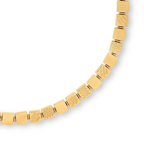 Ludique et élégant, le collier LV Cube s’inspire de deux icônes de l’histoire de la Maison : le motif Damier emblématique et le Pateki, un jeu de réflexion imaginé par Gaston Vuitton en 1932. Des cubes articulés en métal doré sont finement gravés de rayures évoquant la toile Damier, ainsi que de la signature Louis Vuitton Paris. Ce collier raffiné et saisissant se porte aussi bien au quotidien que pour une occasion spéciale.