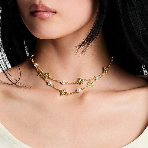 Inspiré par la voûte étoilée, ce collier Pearl Constellations associe des emblèmes de la Maison à l’éclat intemporel de la perle. Suspendus à une fine double chaîne, une constellation de fleurs de Monogram et un emblème LV Circle en métal doré alternent avec de lumineuses perles blanches en résine, évoquant la beauté céleste. Un bijou ultra-féminin empreint d’une élégance discrète.