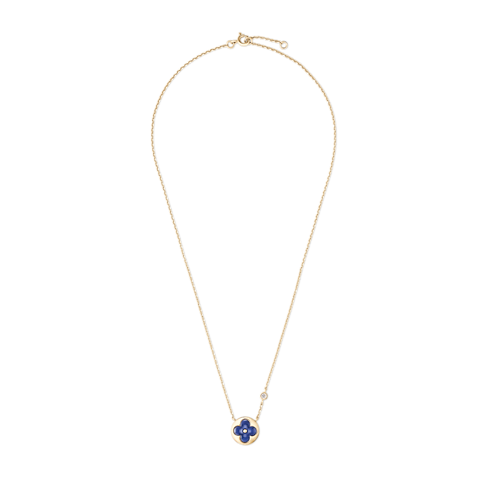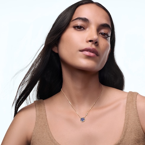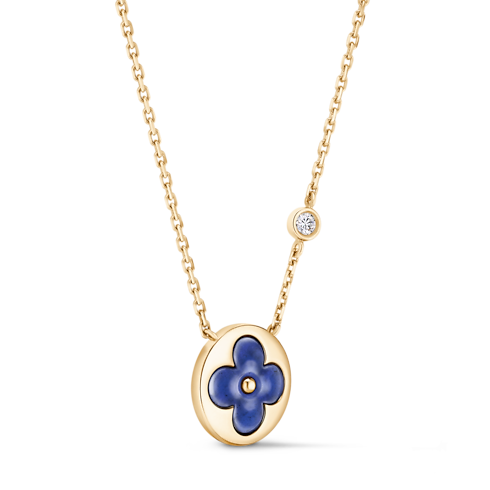 Les pièces Color Blossom célèbrent l’emblématique fleur de Monogram, créée en 1896 par Georges-Louis Vuitton, fils du fondateur de la Maison. Confectionné en or jaune 18 karats (750/1000), ce précieux collier pendentif présente un motif Sun sculpté dans de la sodalite polie à la main d'une brillance intense, rehaussé d'un diamant taille ronde brillant sur la chaîne. Des mois de travail ont été nécessaires pour parfaire les courbes subtiles et l’éclat de la pierre. Ce ravissant bijou se prête aux superpositions et aux associations avec d’autres créations de la collection.