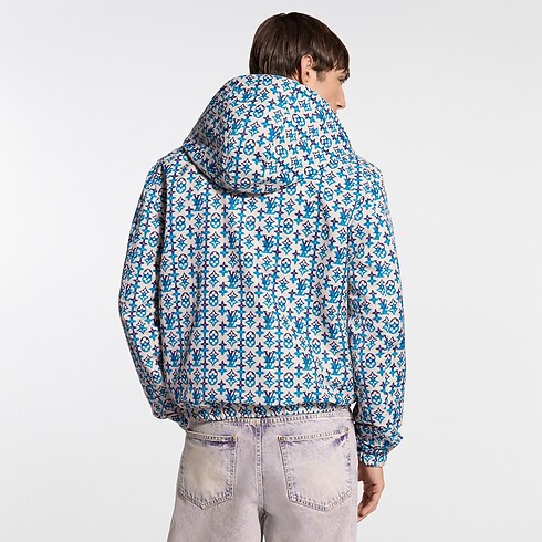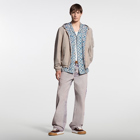 Ce coupe-vent réversible présente une face à la nuance beige intemporelle aisée à associer, rehaussée d’une signature brodée ton sur ton sur la poitrine. Le verso est orné du motif Monogram Overlap graphique du défilé Printemps-Été 2026, décliné dans des tons éclatants de turquoise et de violet inspirés de l'artisanat indien somptueux. Cette pièce technique convient en toute occasion.