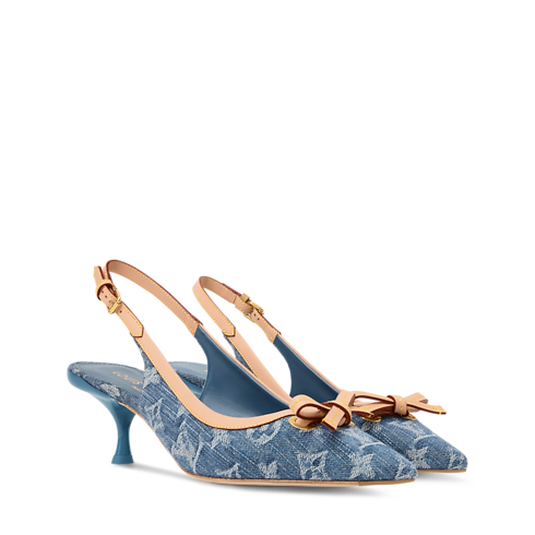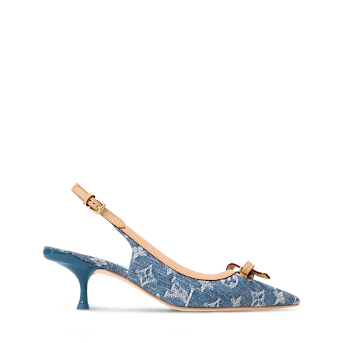 Cet escarpin ouvert 6AM associe le denim Monogram au cuir naturel emblématique de la Maison avec une sophistication estivale. Il présente un bout pointu agrémenté d’un nœud en cuir, tandis que la bride talon s'ajuste à l’aide d’une boucle dorée. Ce modèle repose sur un petit talon féminin assorti à la tige pour offrir une allure raffinée.