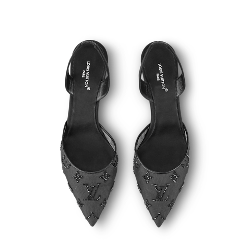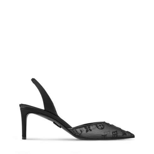 Le mesh translucide et les cristaux Swarovski™ s'associent pour créer l'esprit glamour de cet escarpin ouvert Gala. La matière transparente dévoilant discrètement le pied est ornée d'une version scintillante du motif Monogram de Louis Vuitton. Le bout pointu et le talon fin mi-haut complètent ce soulier élégant et confortable idéal en soirée.