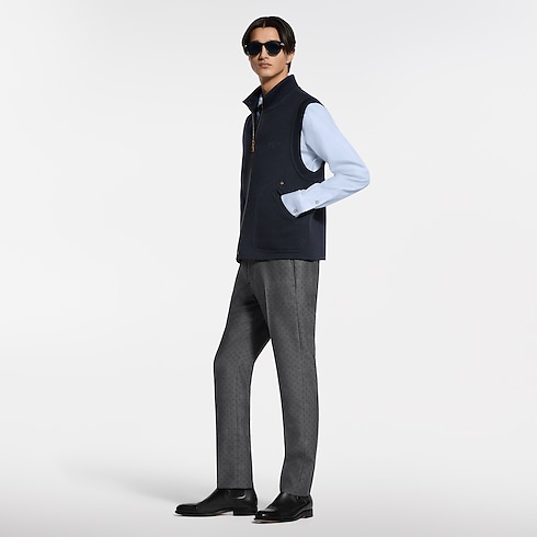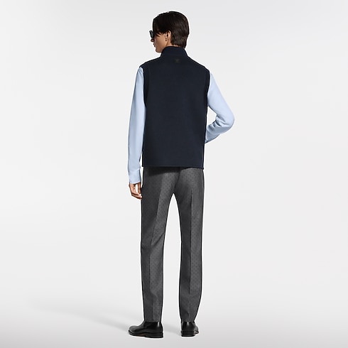 Idéal en superposition pour la mi-saison, ce gilet bleu marine réversible se porte avec élégance sur une chemise ou un pull, ou se glisse sous une veste. Il est confectionné en tissu double face dans un mélange chaud et somptueux de laine, de cachemire et de soie. Il propose un côté uni au style intemporel rehaussé de strass discrets sur la poitrine, de rivets fleur de Monogram sur les poches et d'un patch en cuir au dos, tandis qu’un motif jacquard Monogram ton sur ton prête au verso un accent graphique.