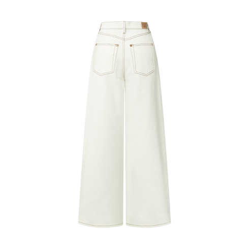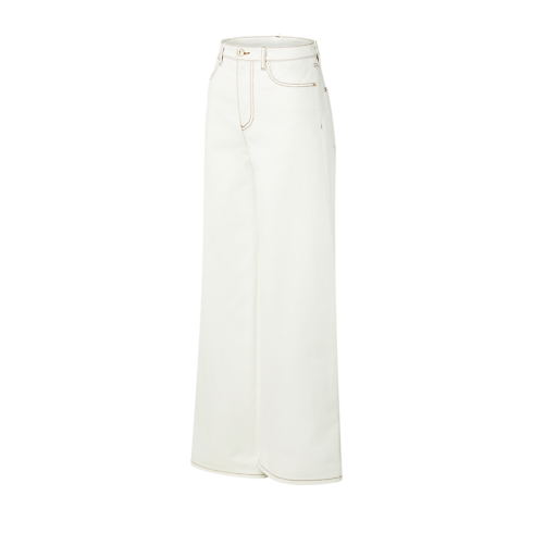 Pièce à l'esprit utilitaire sophistiqué, ce jean s'habille de gabardine de coton sublimée par des surpiqûres contrastées qui mettent en valeur sa structure dotée de cinq poches. Il adopte une coupe large et épurée qui incarne l'élégance au quotidien. Un bouton LV émaillé signe la braguette, tandis que la taille s'agrémente d’un empiècement Louis Vuitton en cuir de la saison.