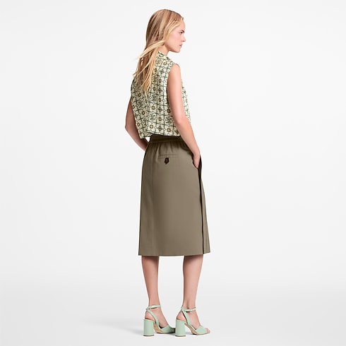 Idéale pour une silhouette quotidienne discrète, cette jupe en sergé de coton présente une coupe droite qui s’arrête au milieu du mollet. Associée à une fermeture éclair à double sens sur l’avant, la ceinture large et élastique lui confère une allure décontractée et sportive. La poche arrière est signée d’une languette LV Initiales qui faisant subtilement référence à la Maison.