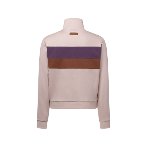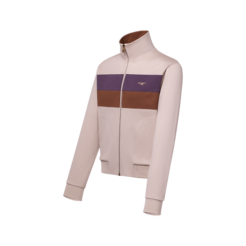 Interprétation sophistiquée d’une silhouette décontractée, cette élégante veste de jogging beige est confectionnée en jersey de coton double-face et rehaussée de bandes contrastées en travers du buste et de lettres Louis Vuitton Paris discrètement estampées en doré sur la poitrine. Le motif graphique LV x The Darjeeling Limited de la saison orne l’intérieur, tandis qu’un patch à signature en cuir apparait au dos.