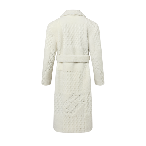 Réalisé sur commande, ce long manteau en shearling blanc présente une silhouette élégante dotée d'une ceinture et d'un motif Damier ton sur ton brodé créant un effet 3D. Au dos, la même technique est utilisée pour composer la signature « Marque L. Vuitton déposée », tandis que les boutons effet perle apportent une note dandy à l'ensemble.