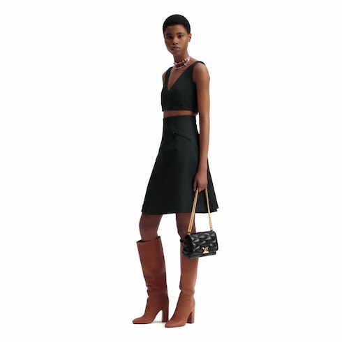 Cette mini-jupe élégante présente une coupe trapèze épurée et une taille très haute flatteuse. Confectionnée en gabardine technique emblématique de la Maison, elle adopte une silhouette moderne et habillée, rehaussée d'une poche avec fermeture à glissière sur le côté, dotée d'une tirette LV Circle. Une languette en cuir embossé orne l'ourlet.