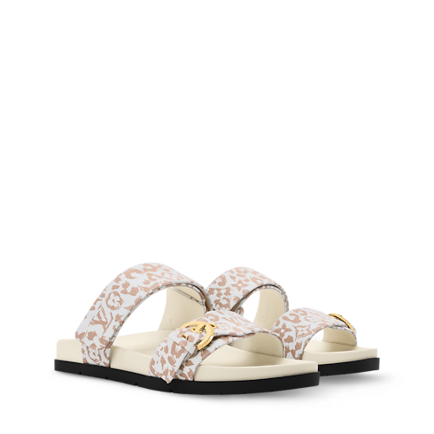Cette mule Bom Dia confort est réinventée en toile Monogram Léopard, un motif phare de la saison. Ce modèle se distingue par ses deux brides ajustables : l'une se ferme à l'aide d'une boucle dorée, et l'autre, signée des LV Initiales, grâce à une attache velcro. Ce soulier comporte une semelle intérieure anatomique confortable et une semelle extérieure en gomme souple.
