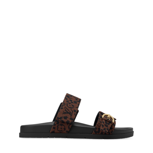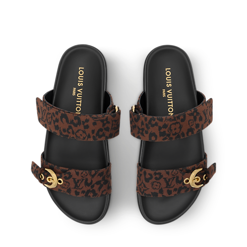 Cette mule Bom Dia confort est réinventée en toile Monogram Léopard, un motif phare de la saison. Ce modèle se distingue par ses deux brides ajustables : l'une se ferme à l'aide d'une boucle dorée, et l'autre, signée des LV Initiales, grâce à une attache velcro. Ce soulier comporte une semelle intérieure anatomique confortable et une semelle extérieure en gomme souple.