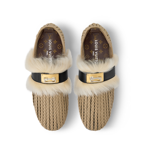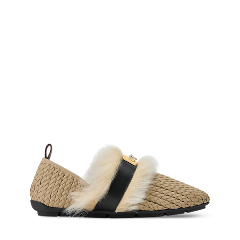 La mule plate fermée Haven se décline en cuir de veau tressé, rehaussé d’une garniture en shearling doux. Imaginée par le directeur artistique des collections Femme Nicolas Ghesquière pour le défilé Printemps-Été 2026, elle associe le confort d'une base en maille souple et le savoir-faire raffiné de tresses de cuir. Elle s’orne d’un accessoire Swing Lock doré, en hommage aux malles historiques de la Maison.