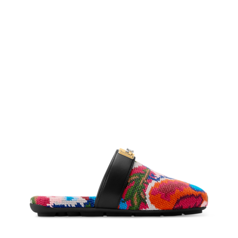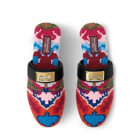 Aperçue sur le podium lors du défilé Printemps-Été 2026, la mule plate Haven à talon ouvert associe confort et savoir-faire raffiné. Sa tige façon tapisserie à l’aspect vintage évoque les tapis orientaux et la broderie française du 19ᵉ siècle. Elle est complétée par une bride en cuir ornée d’un accessoire Swing Lock doré inspiré des poignées des malles Louis Vuitton.