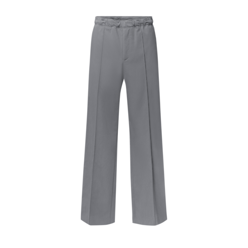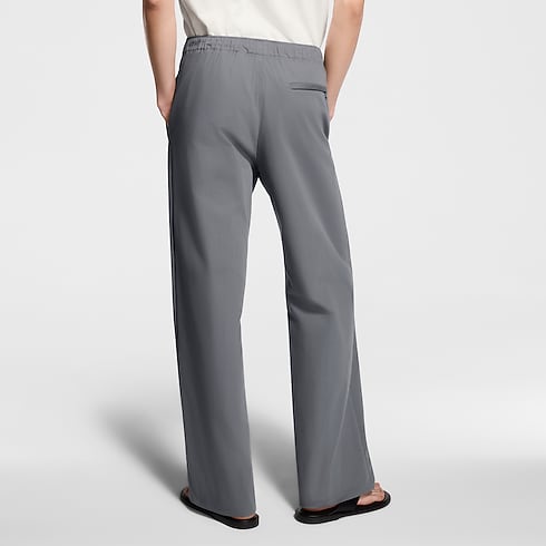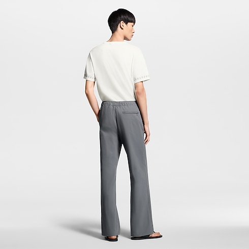 Confectionné en crêpe de satin en coton mélangé, ce pantalon léger gris pâle offre un style à la fois habillé et décontracté pour composer des looks naturellement élégants. Sa silhouette drapée associe une taille élastique confortable à des plis sur le devant, tandis que le lettrage Louis Vuitton sportif imprimé en silicone signe la jambe gauche d'un détail contemporain. Idéal à porter au printemps, ce modèle crée un contraste raffiné avec les motifs floraux de cette collection.